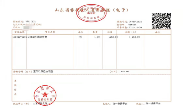 职工子女幼儿园保教费,由父母双方凭幼儿园开具的由省财政厅统一印制的财政票据或由税务机关出具的正式发票进行报销,学校不受理街道办事处、居委会及家庭幼儿园(所)等名义为其开具的票据。人事处负责审核职工基本信息,财务处负责审定报销金额。票据样式参考见下图: