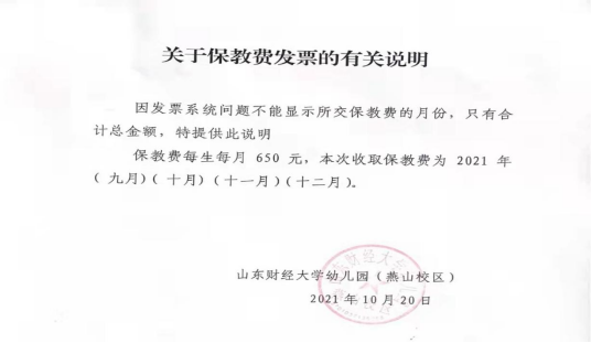 2021年公立幼儿园保教费收费改革,改革后的保教费发票为“山东省非税收入通用票据(电子)”发票,发票上没有备注具体的缴费期间,而保教费报销需按月计算可报销金额,因此,报销时除提供保教费相关报销票据(图一)外,还需提供幼儿园开具的保教费发票说明(见图二),票据上已备注缴费期间的,可不再提供此说明。每张电子发票需手写备注“此发票未重复报销”字样。