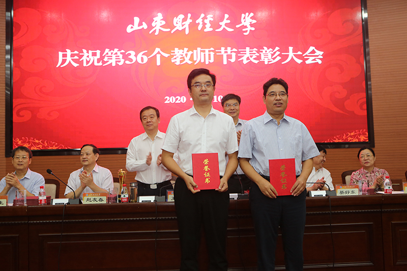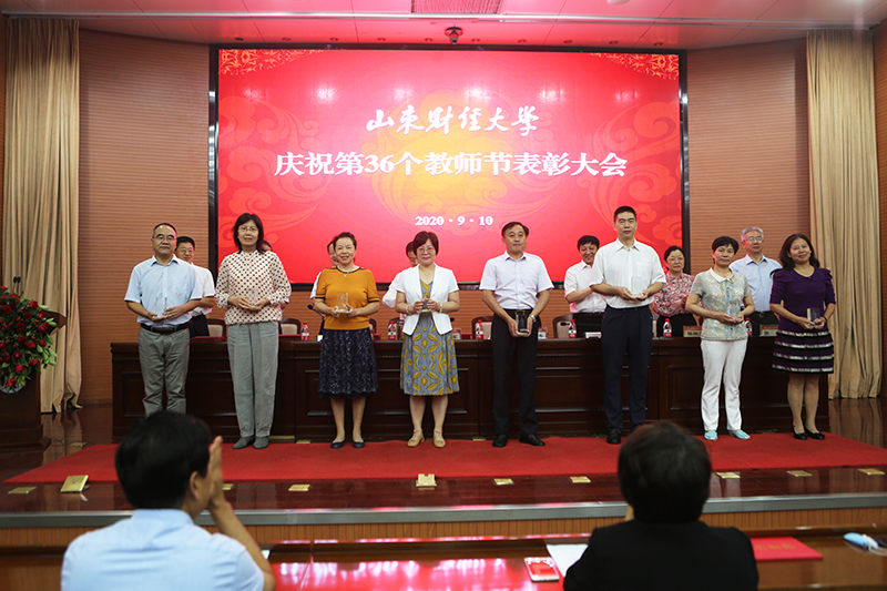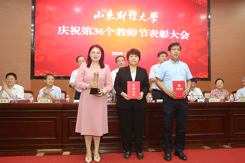 伴随着欢快的乐曲,校领导为受表彰个人颁发荣誉证书或奖杯。国家级人才、国家“有突出贡献中青年专家”,教育部高等学校科学研究优秀成果奖(人文社科)获奖者,山东省有突出贡献的中青年专家,山东省金融高端人才,山东省教书育人楷模,山东省第七届“超星杯”高校青年教师教学比赛获奖者,第五届山东省辅导员素质能力大赛获奖者,从事高等教育工作满30周年在职教职工,优秀教师、优秀教育工作者、科研标兵、教学名师、师德师风先进个人、“最美教师”和教书育人楷模、教学奖获奖者满怀喜悦依次走上主席台领奖。会场内不时响起阵阵掌声,气氛热烈。